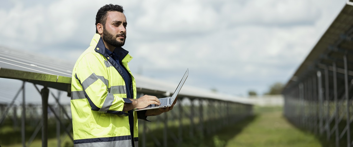 Renewable Energy Resource Field Assessment. Side view of Male Solar energy engineers use a laptop computer in a solar panels module to assessment and analyzing solar resource measurements for next project.